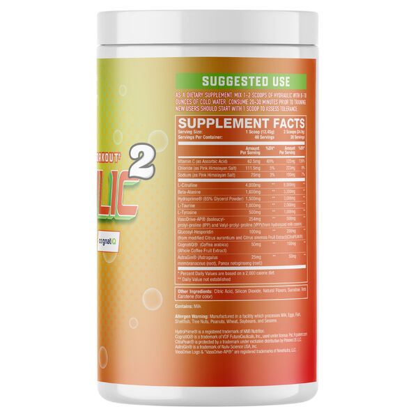 This formula is built around pump, hydration, performance and focus support. Key ingredients highlighted on the official product page include L-Citrulline, Beta-Alanine, VasoDrive-AP®, CitraPEAK®, HydroPrime®, Cognatiq® and Astragin®, giving Hydraulic V2 a more rounded non-stim pre-workout profile.