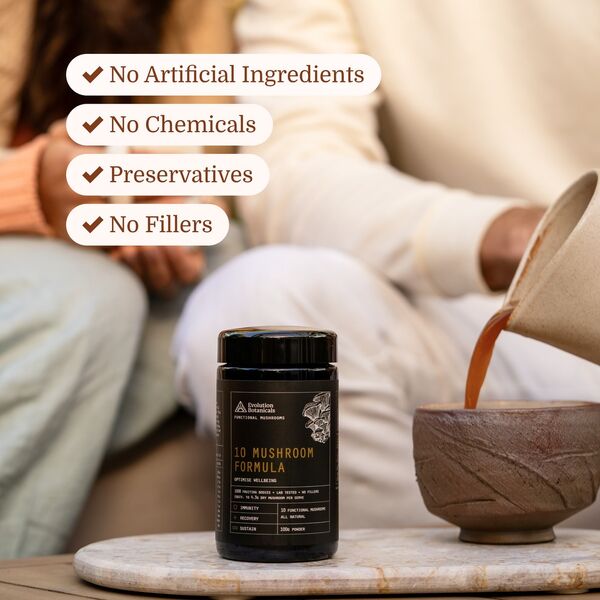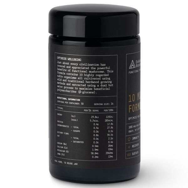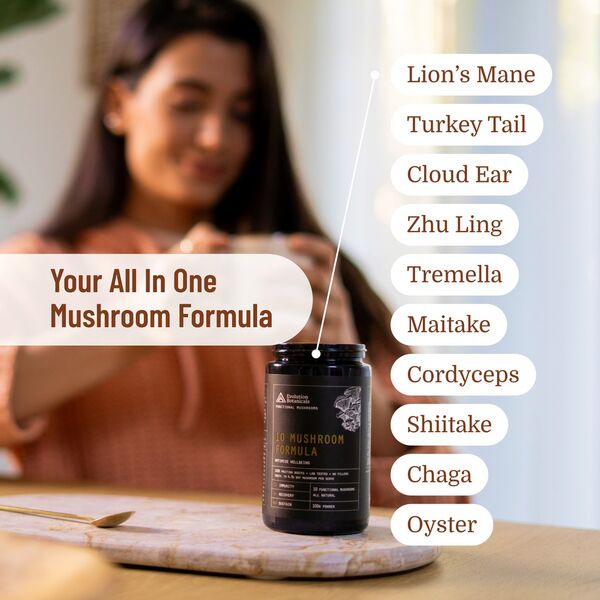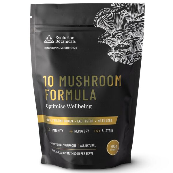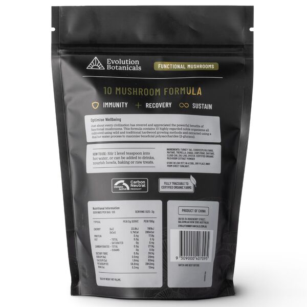 Evolution Botanicals 10 Mushroom Formula Powder is a full-spectrum organic mushroom blend created for convenient daily use. This formula combines ten functional mushrooms in one powder, making it a practical option for customers looking to support immunity, energy, focus, recovery and everyday well-being as part of a balanced routine.