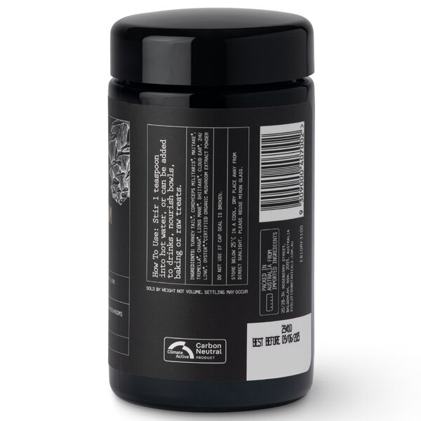 The blend includes Turkey Tail, Cordyceps militaris, Maitake, Tremella, Chaga, Lion’s Mane, Shiitake, Cloud Ear, Zhu Ling and Oyster mushroom. It is made from 100% fruiting bodies, contains more than 30% beta-glucans, and is produced without fillers or excipients.