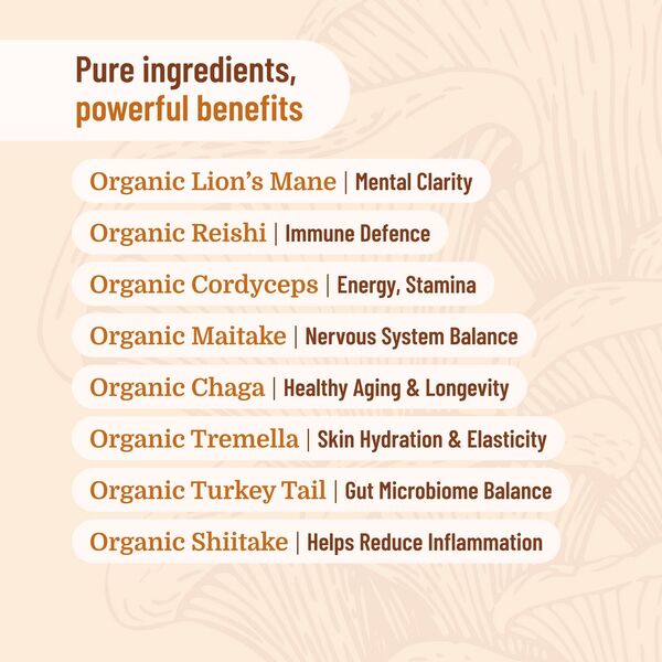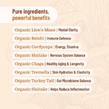 Organic Mushroom Extract Powder, which includes Turkey Tail, Cordyceps militaris, Maitake, Tremella, Chaga, Lion's Mane, Shiitake, Cloud Ear, Zhu Ling and Oyster.