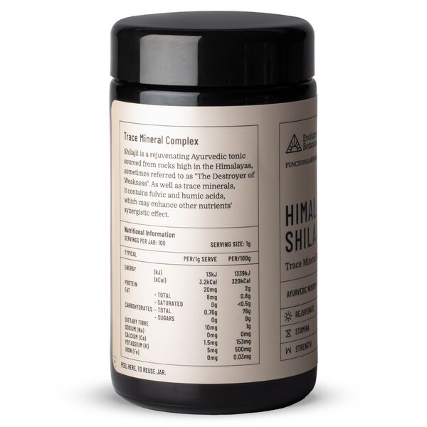 Evolution Botanicals place a strong emphasis on quality, consistency, and effectiveness. The company has selected a highly regarded, awarded, and trusted Indian partner with 30 years' experience in Ayurvedic formulations to supply our Himalayan Shilajit. Rigorous safety testing protocols are followed, ensuring the Himalayan Shilajit powder contains a full trace mineral complex and high levels of rejuvenating Fulvic acid.