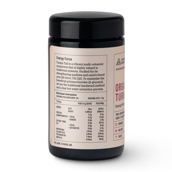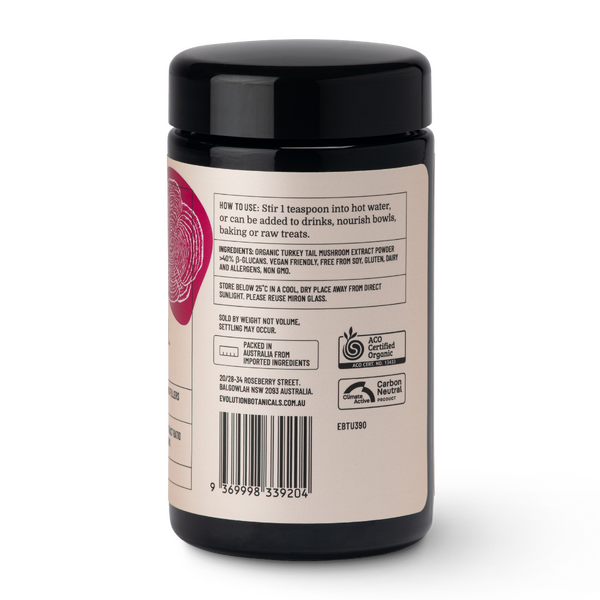 Evolution Botanicals Organic Turkey Tail 90g Powder is a certified organic mushroom extract made from 100% fruiting bodies. It is commonly chosen by customers looking for daily support for immune health, digestive balance and everyday well-being, with a smooth earthy powder that can be enjoyed as a tea or added to food and drinks.