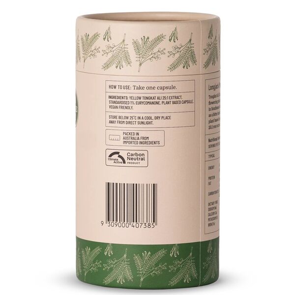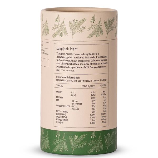 This formula uses wild-grown Tongkat Ali root from South Malaysia in a concentrated 25:1 extract standardised to 1% eurycomanone. Each capsule provides 500mg per serve, and each tube contains 120 capsules, giving customers a simple once-daily option that fits easily into active lifestyles and wellness routines.