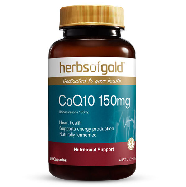 Herbs of Gold CoQ10 150mg contains naturally fermented coenzyme Q10 in a soy-free rice bran oil base.