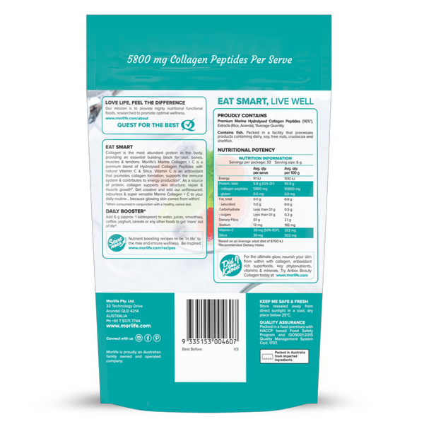 Morlife has also added acerola extract & Australian kakadu plum as natural sources of vitamin C to support the production of collagen & cartilage. As a source of protein, collagen will support skin structure, repair, and muscle growth. Be creative and add our versatile Marine Collagen to your daily routine… because a healthy outside starts from the inside!