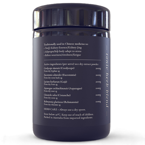 Each ingredient is a traditional Chinese herb renowned for its adaptogenic and anti-inflammatory properties: cordyceps, eucommia bark, goji berry, cistanche stem, rehmannia root and asparagus root.