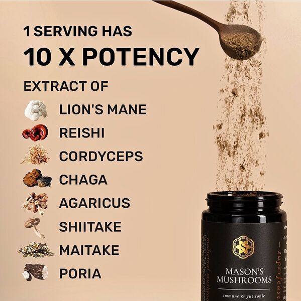 Superfeast Mason's Mushrooms 100g Powder is a full-spectrum medicinal mushroom blend featuring eight mushroom extracts, including Chaga, Reishi, Lion’s Mane, Cordyceps, Agaricus, Shiitake, Poria and Maitake. Superfeast positions this formula around gut support, immunity, sustained energy and sharper focus, and the product is offered in a 100g jar format.