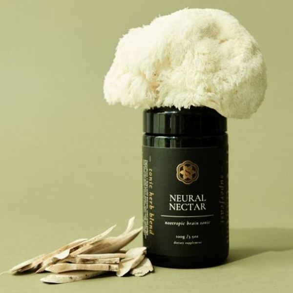 A Superfeast article describes Neural Nectar as containing Mucuna, Ginkgo biloba, Lion’s Mane, White Peony and Astragalus.