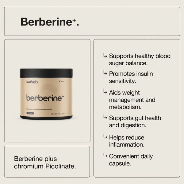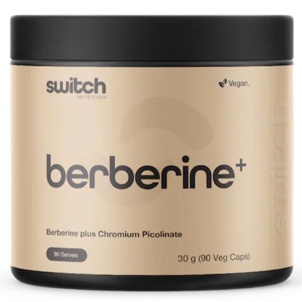 Switch Nutrition Berberine+ combines naturally occurring berberine from Berberis aristata with chromium from chromium picolinate in a convenient capsule format. It is positioned to support healthy blood sugar regulation, carbohydrate metabolism and overall metabolic health.