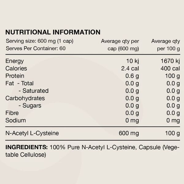 In the body, cysteine contributes to glutathione production. Glutathione is an antioxidant that helps protect cells from oxidative stress and supports normal immune system function. This capsule format provides 600mg NAC per serve, with 60 serves per container.