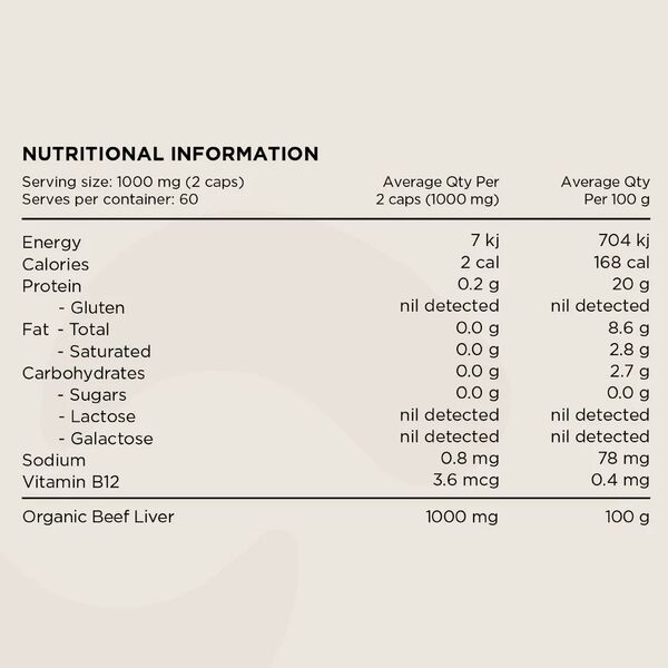 Australian Organic Grass Fed Beef Liver, Natural Anti-Caking Agent (Silicon Dioxide), Capsule (Vegetable Cellulose).
