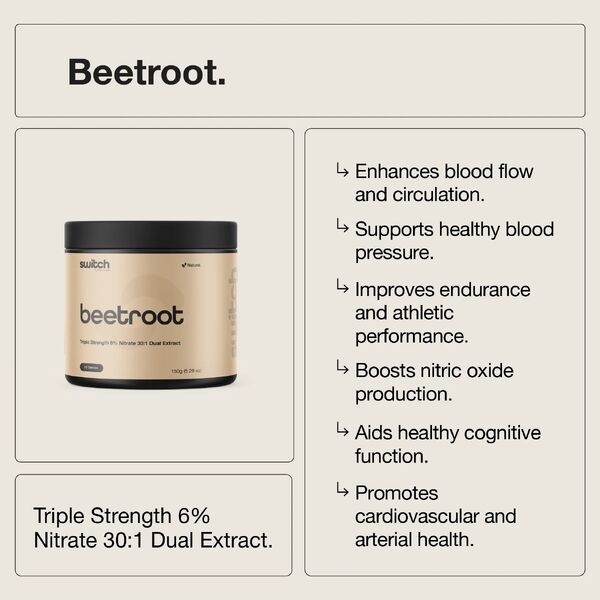 Switch Nutrition Organic Beetroot Powder delivers a convenient way to add nutrient-rich beetroot into your daily routine. Naturally rich in nitrates, beetroot supports blood flow and oxygen delivery, making it popular for both general well-being and performance support.