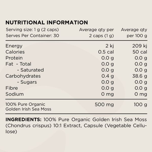 This product contains 100% pure organic golden Irish sea moss using Chondrus crispus 10:1 extract.