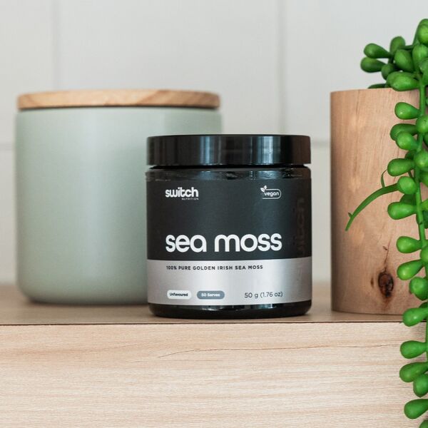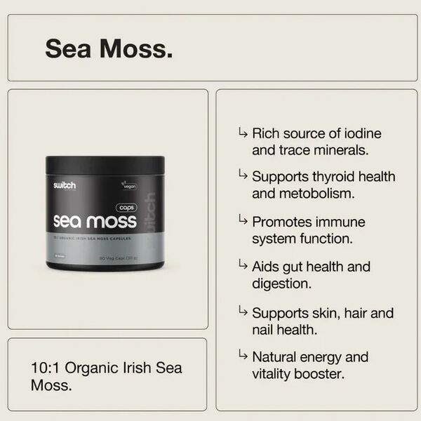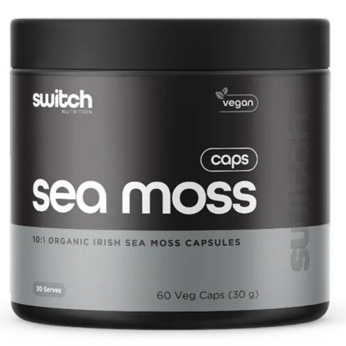 Switch Nutrition Sea Moss Irish Organic 60 Capsules features 100% pure organic golden Irish sea moss sourced from the pristine waters of the northern Atlantic Canadian coast. Switch Nutrition states its wildcrafted sea moss is seasonally harvested, dried at low temperatures, then concentrated and micronised, with each 1g serve delivering organic golden Irish sea moss 10:1 extract in a vegan capsule format.