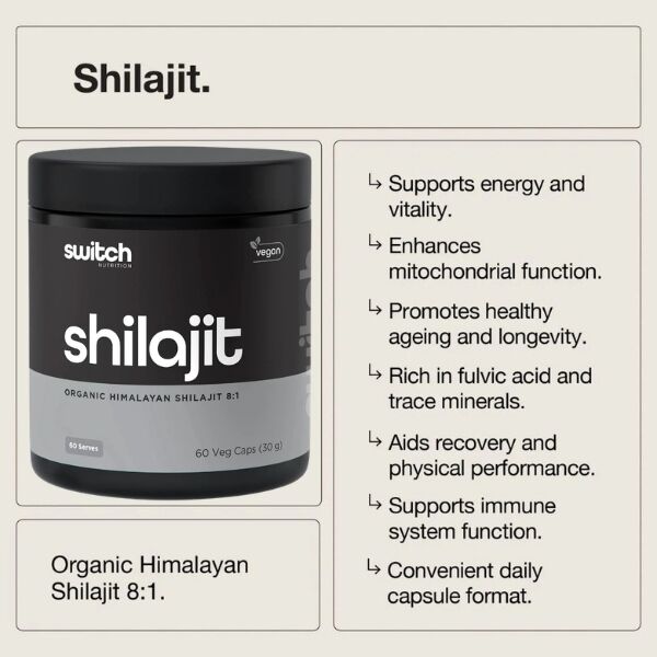 Switch Nutrition Shilajit is a premium-grade resin powder sourced from mineral-rich regions and traditionally used to support vitality, stamina and overall well-being. Naturally rich in fulvic acid and trace minerals, Shilajit helps support nutrient absorption, energy production and daily performance.